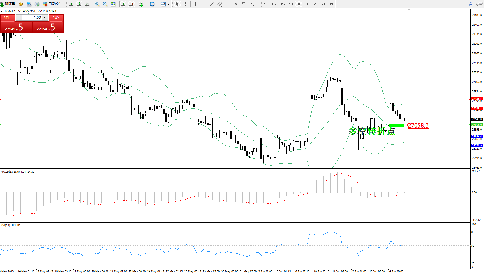 恒指HK50 ——小时K线图显示:
