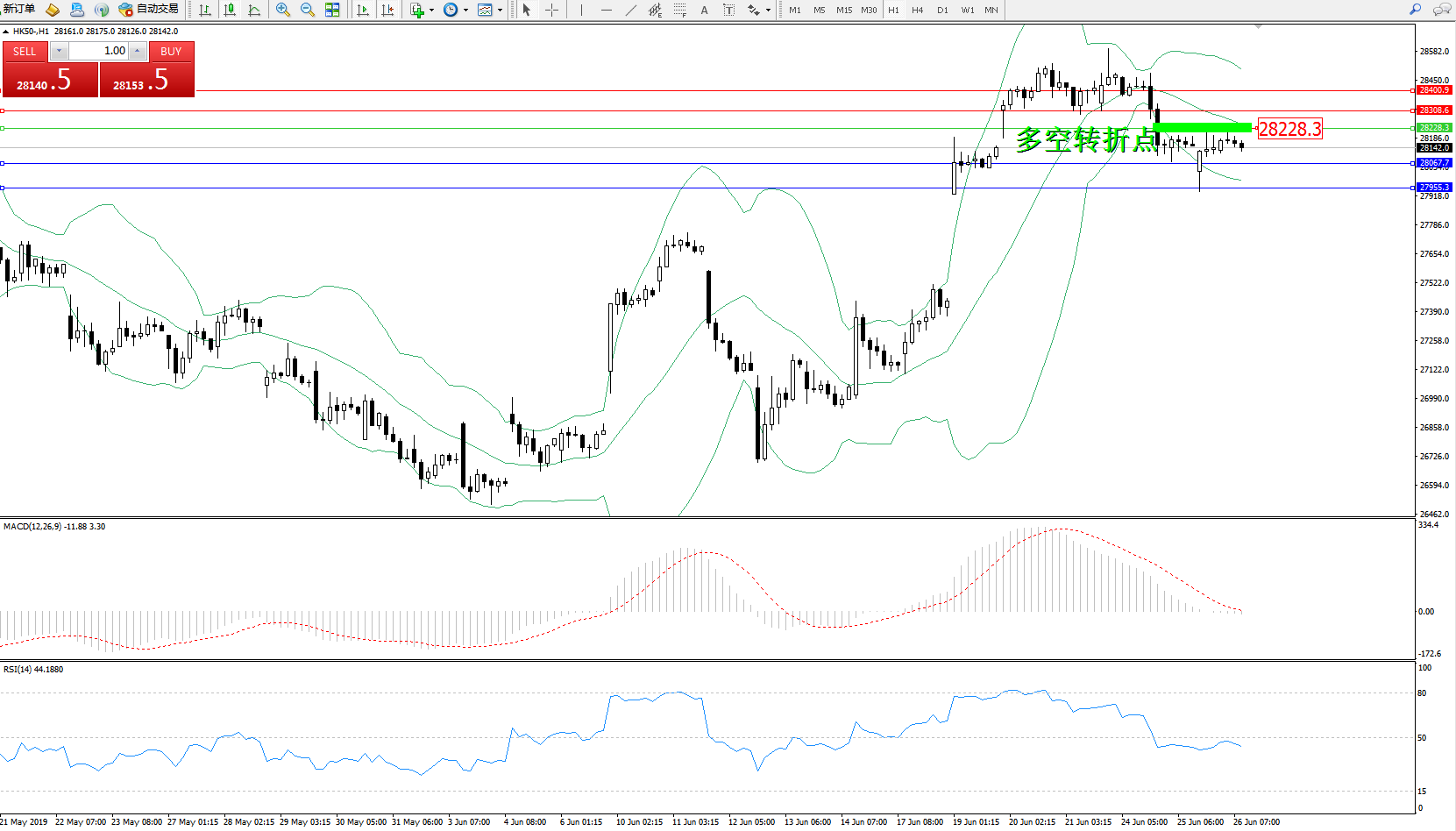 香港恒生指数6月26日(周三)收盘上涨36.00点,涨幅0.13%,报28221.98点;港股上周跳涨,本周在利空因素的影响下,开始陷入调整,成交额也大幅萎缩。就目前情况来看,市场已经消化G20会面的利好,而隔夜方面,鲍威尔及美联储其他官员的讲话,令市场对深度减息的预期有所降低,隔夜美股亦受影响表现偏弱,因此港股压力较大。