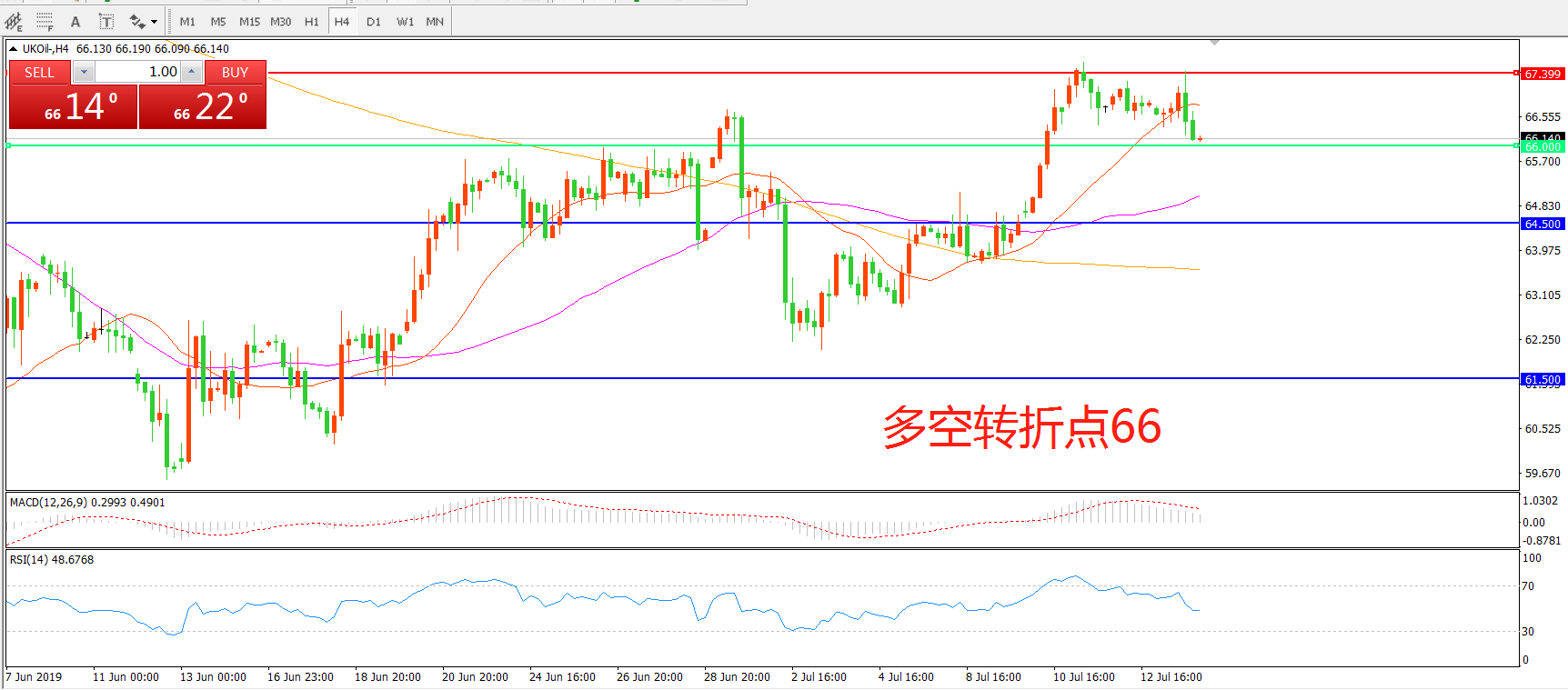 4小时图看,油价冲高回落,但整体依然处于多空分水岭之上,均线系统走平, MACD红柱缩短, RSI指标向下,日内走势震荡概率较大,重点关注66美金得失。
