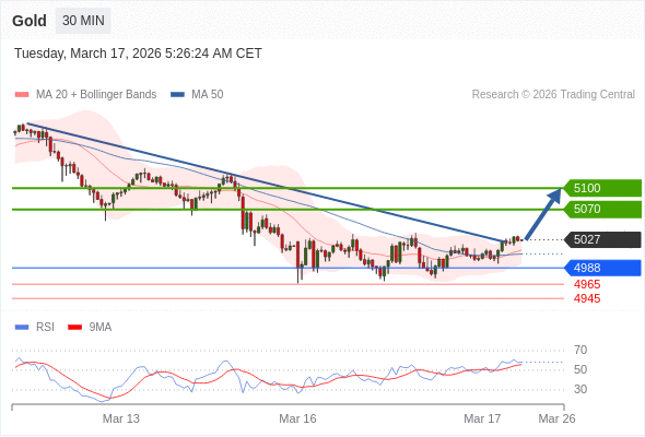 在 4988 之上,看涨,目标价位为 5070 ,然后为 5100 。