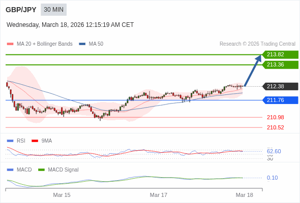 英镑/日元 当日内 : 看涨,当 211.76 为支撑位,目标定在213.82。