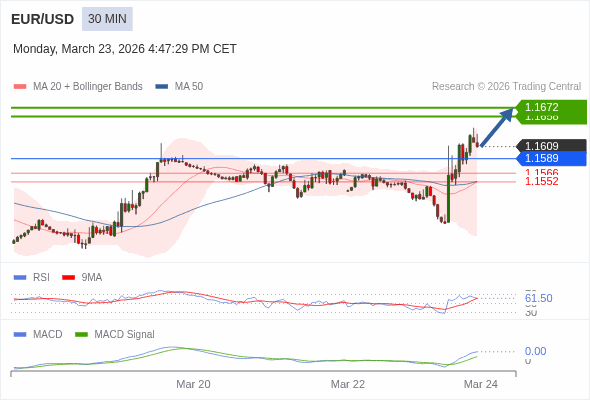 欧元/美元 当日内 : 看涨,当 1.1589 为支撑位。