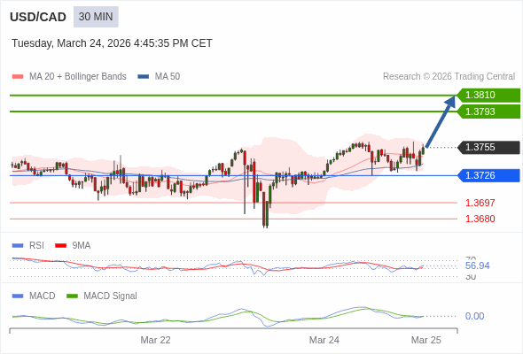 美元/加元 当日内 : 看涨,当 1.3726 为支撑位。