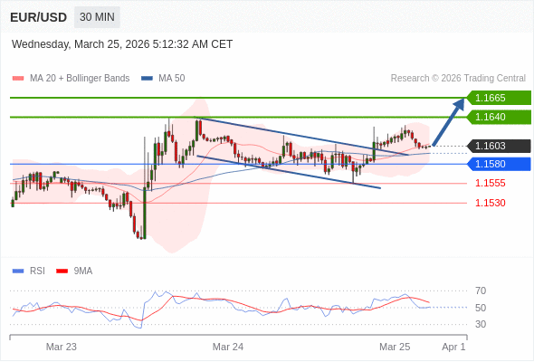 欧元/美元 当日内: 在1.1580之上,看涨。