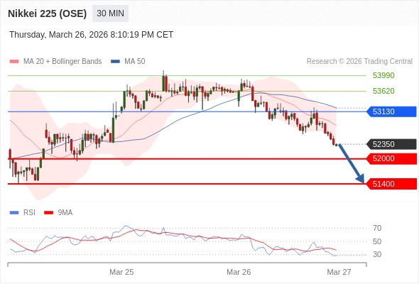 在 53130 之下,看跌,目标价位为 52000 ,然后为 51400 。