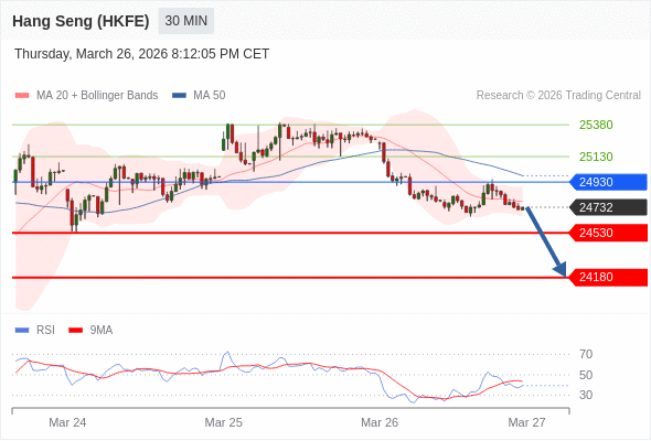 在 24930 之下,看跌,目标价位为 24530 ,然后为 24180 。