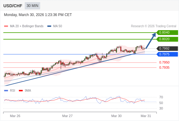 在 0.7975 之上,看涨,目标价位为 0.8020 ,然后为 0.8040 。