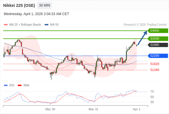 在 52200 之上,看涨,目标价位为 53430 ,然后为 54000 。