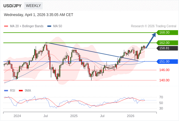 在 151.00 之上,看涨,目标价位为 162.00 ,然后为 168.00 。
