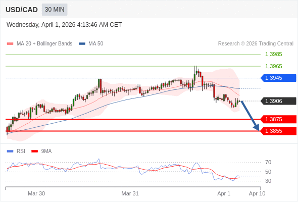 在 1.3945 之下,看跌,目标价位为 1.3875 ,然后为 1.3855 。