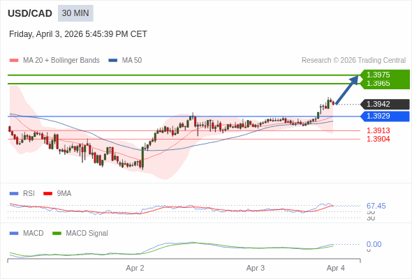 美元/加元 当日内 : 看涨,当 1.3929 为支撑位。