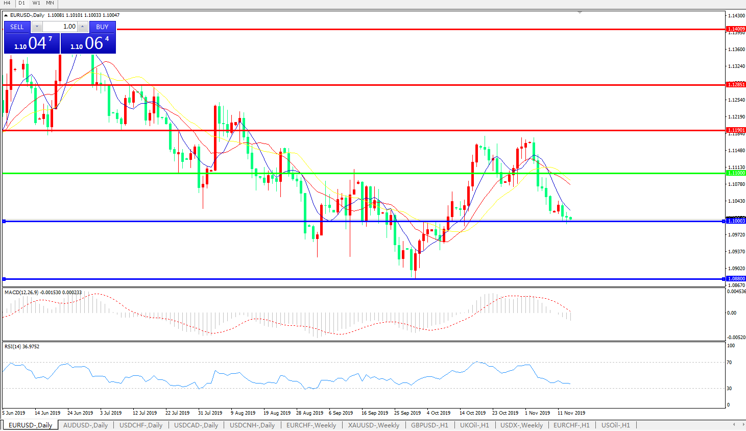 技术面简析:日图均线呈空头排列,汇价继续小幅下行在1.10关口有所反复,MACD逼近0轴且量能0轴下方持续放量,RSI继续小幅下探,重点关注1.10关口附近支撑是否有效,预计短期汇价有进一步下行空间。