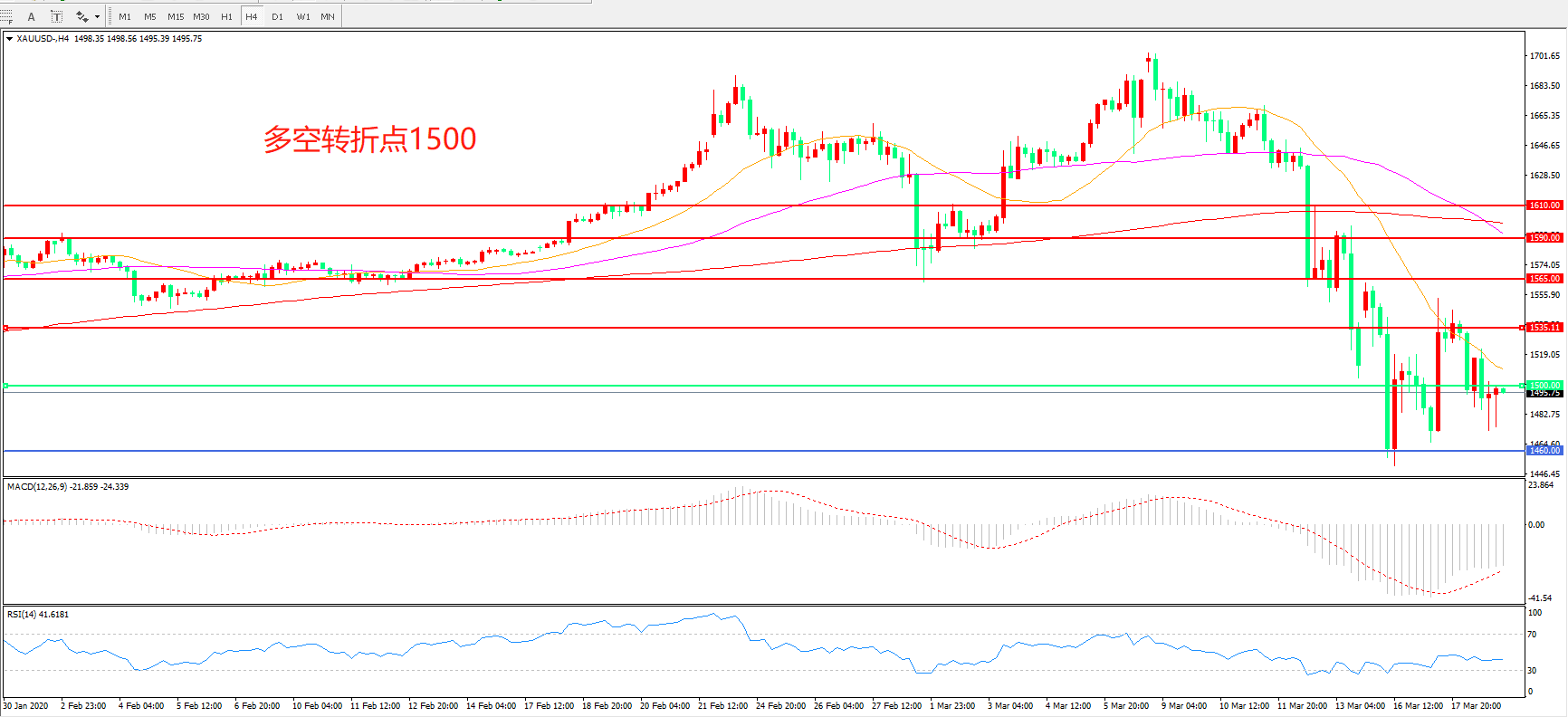 交易策略: 在 1500.00之下看跌,目标1460.00   1400.00