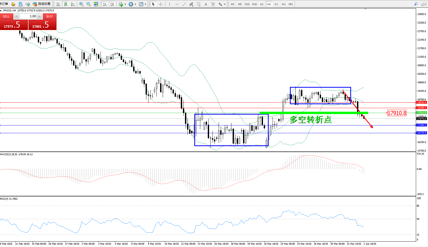 日经指数JPN225——4小时K线图显示: