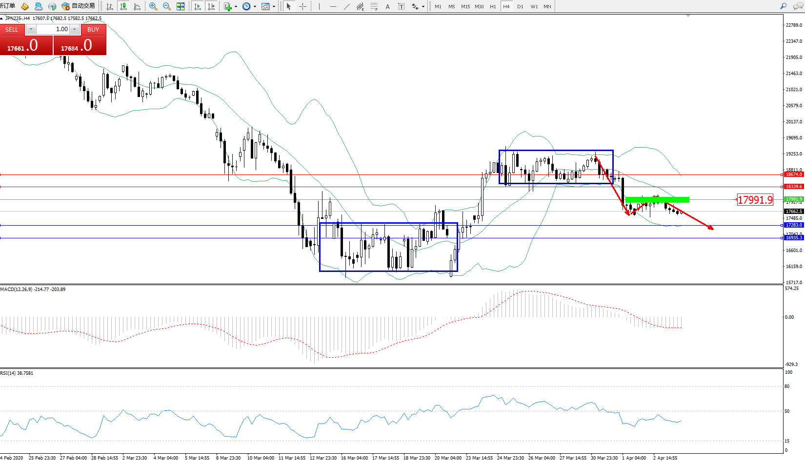 日经指数JPN225——4小时K线图显示: