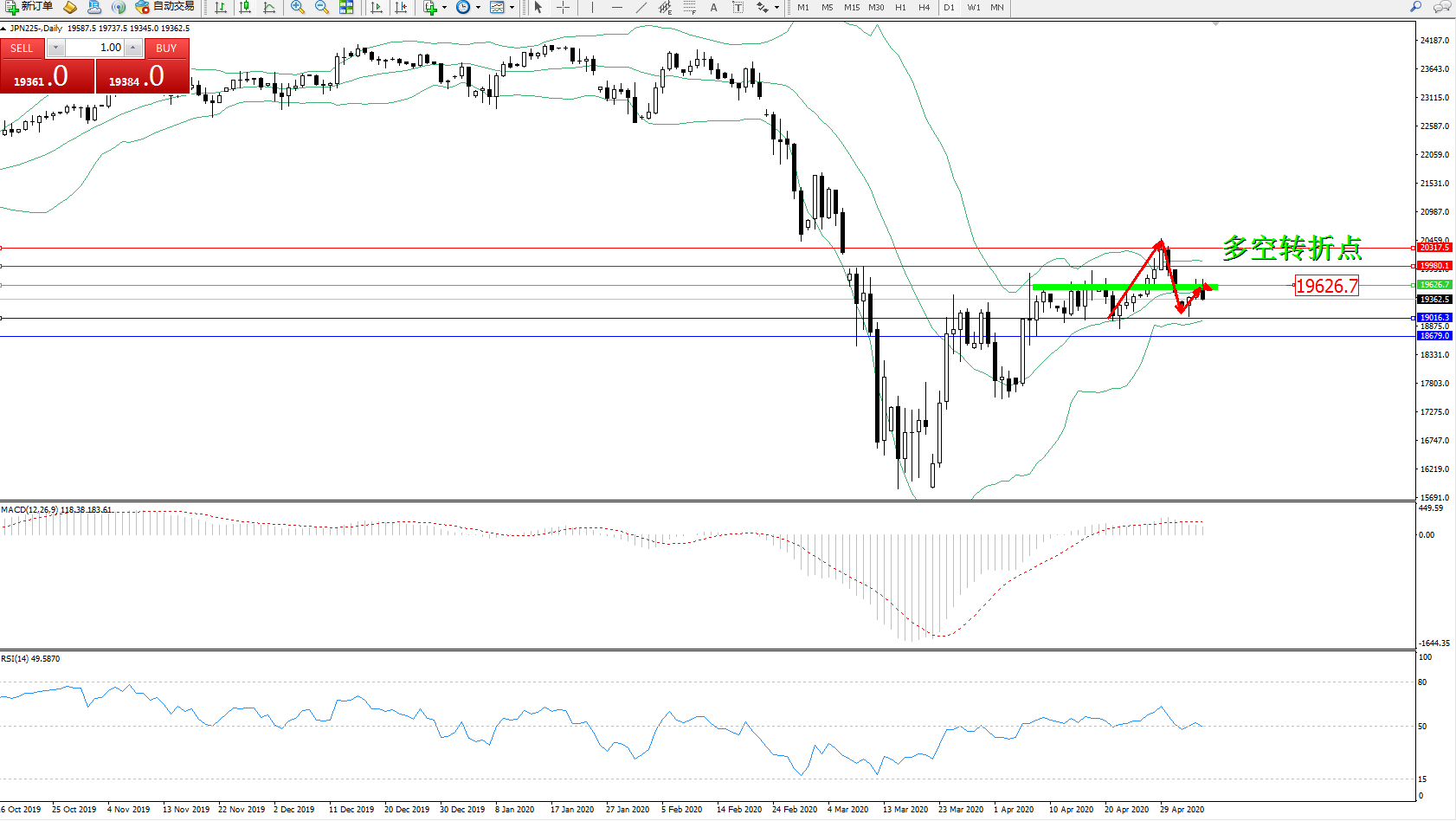 日经225指数5月1日(周五)收盘下跌566.19点,跌幅2.80%,报19627.50点。日内亚洲股市纷纷大跌,新冠肺炎疫情对全球经济的影响开始显现,近期公布的企业财报也令投资者失望,日本4月制造业PMI终值萎缩速度为11年以来最快,而日本首相安倍晋三计划延长紧急状态,摩根大通下调日本第二季度GDP增速预期。目前,摩根大通预计日本第二季度GDP年化季率萎缩42%,较此前预期进一步下调7个百分点。预计日本第三季度经济或将基本恢复正常,但即便至今年年底,经济活动也不太可能恢复到疫情大流行前水平。
