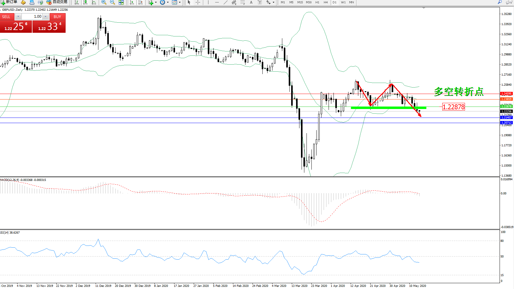 交易策略:1.22878下方看跌,目标1.214071.20712