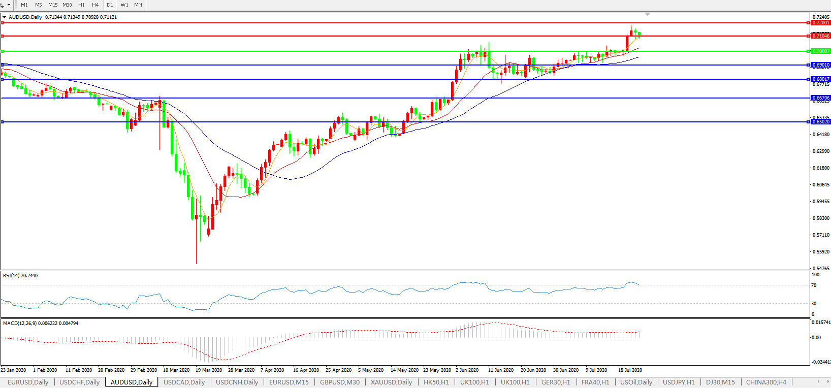 交易策略:0.7000上方看涨,目标0.7100、 0.7200