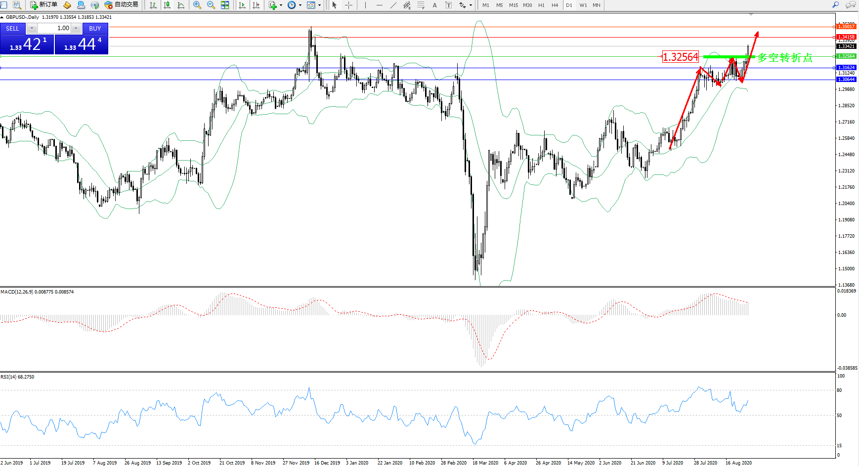 交易策略:1.32564上方看涨,目标1.34158、1.35017