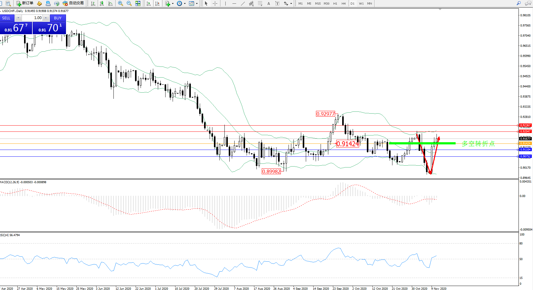 交易策略:0.91424上方看涨,目标0.92047、0.92367