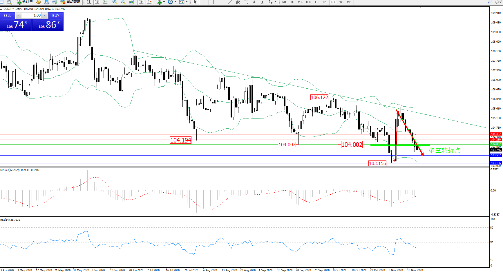 技术点评:低位多头动力趋势拉升上扬后,高位即将触及布林带指标上轨附近出现反转震荡下行走势,跌势未有止步迹象,空头动力强劲,布林带指标呈收口平移走势持续中,且有继续向下移动态势,前期低位103.156位置近在咫尺,MACD指标处于空头区域低位震荡回升后开始反转下行中,RSI指标处于50均衡线下方弱势整理后开始下行中;