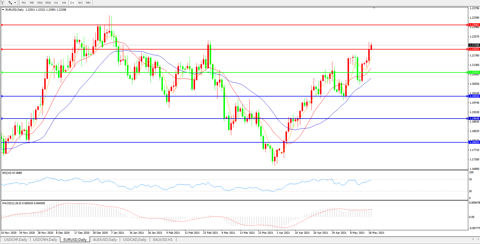 技术面简析:日图均线呈上行态势,汇价继续攀升,MACD运行于0轴上但量能开始微放量,RSI缓步走升,预计短期汇价大概率将在整理后进一步上行。