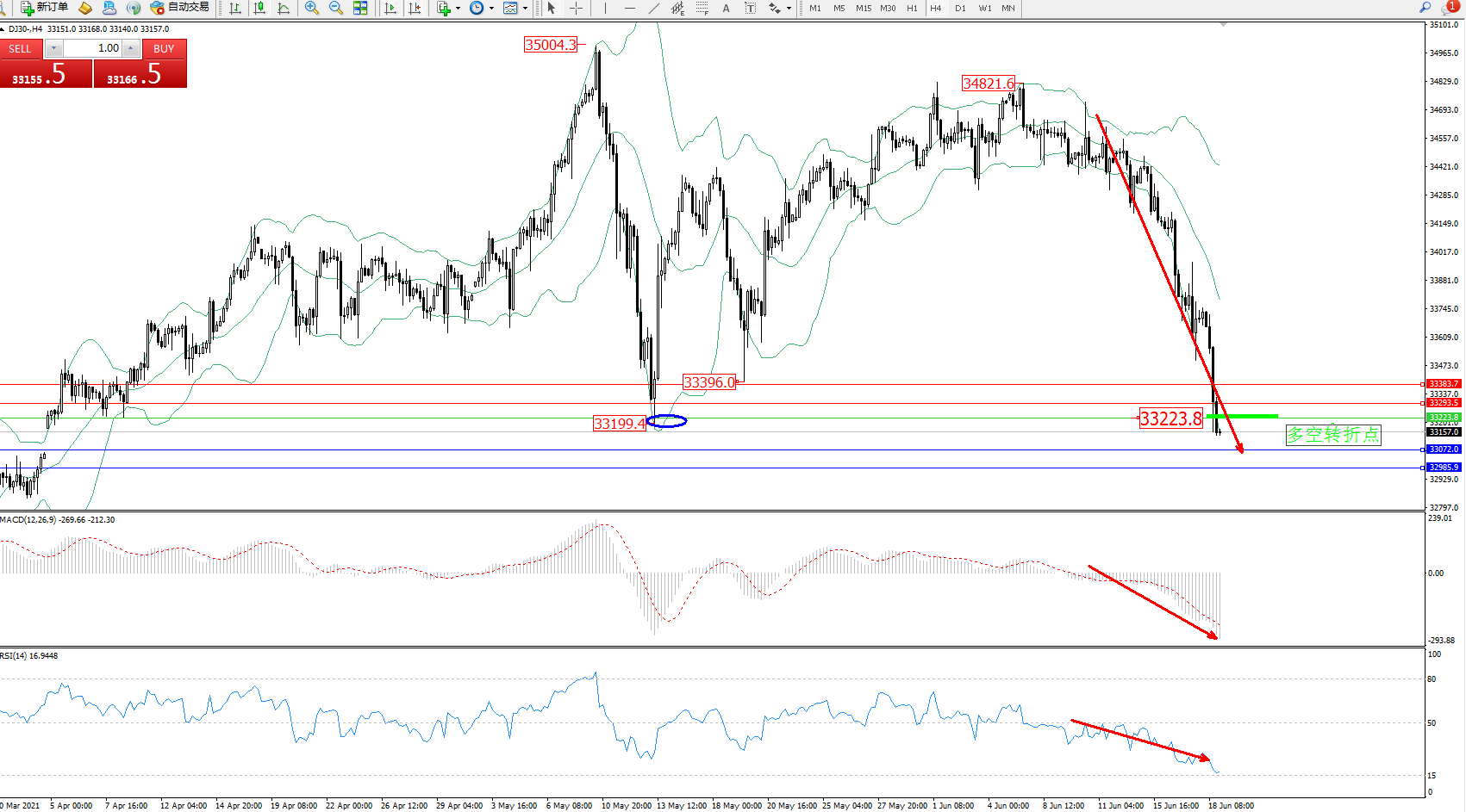 道琼斯指数DJ30——4小时K线图显示: