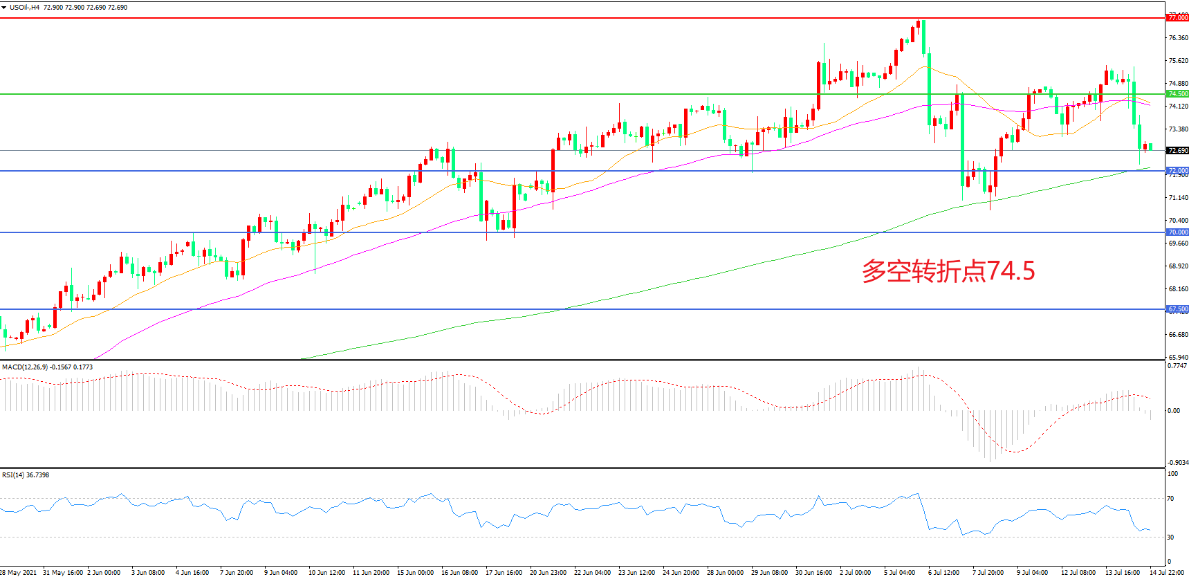 交易策略:在74.50之下看跌,目标72.00      70.00