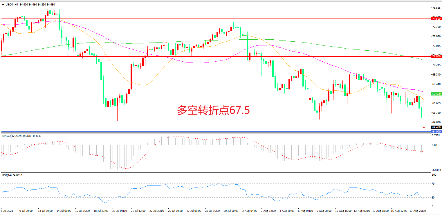 周三(8月18日),根据美国能源信息署公布的数据显示,当周EIA原油库存减少323.30万桶,远高于市场预期,悲观情绪导致油价快速下跌,美国WTI原油长阴下破,收报65.42美元/桶。周四(8月19日),油价再次跳空低开,距离66.5美元支撑仅一步之遥,日内可能有回补缺口的小幅反弹,但空头已经占据市场中的主动。