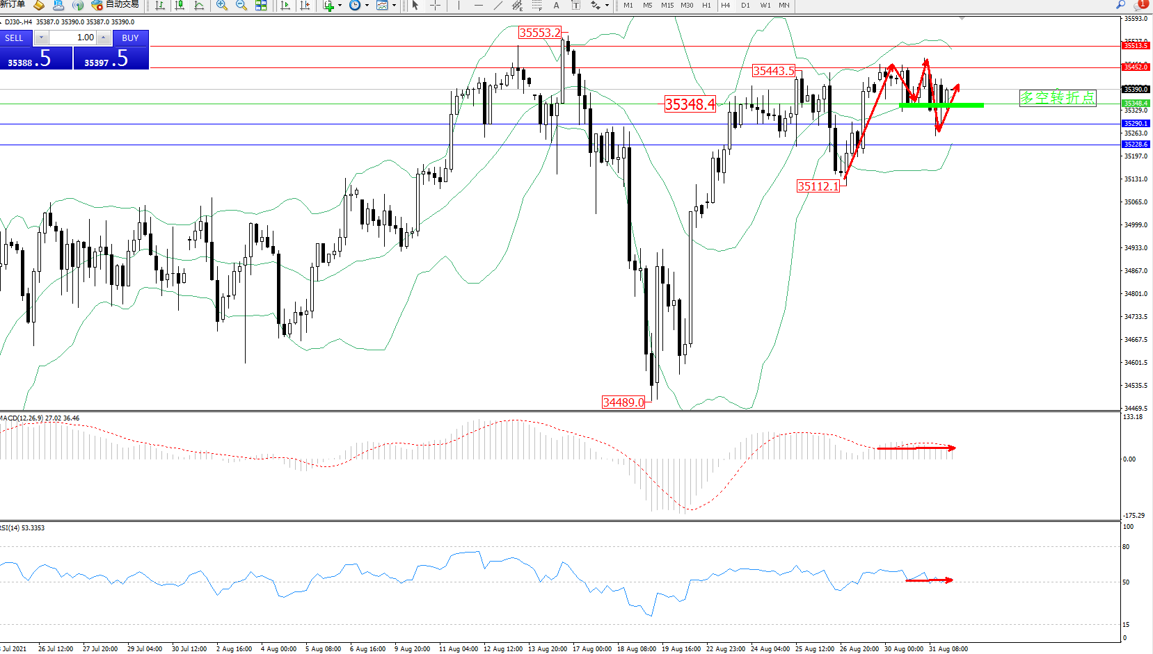 道琼斯指数DJ30——4小时K线图显示: