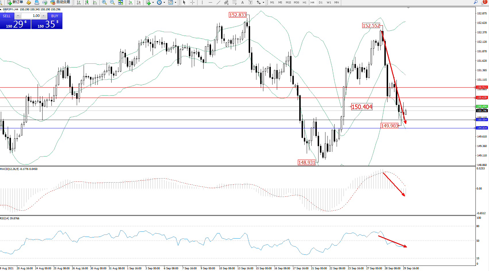 交易策略:150.404下方看跌,目标150.054、149.834