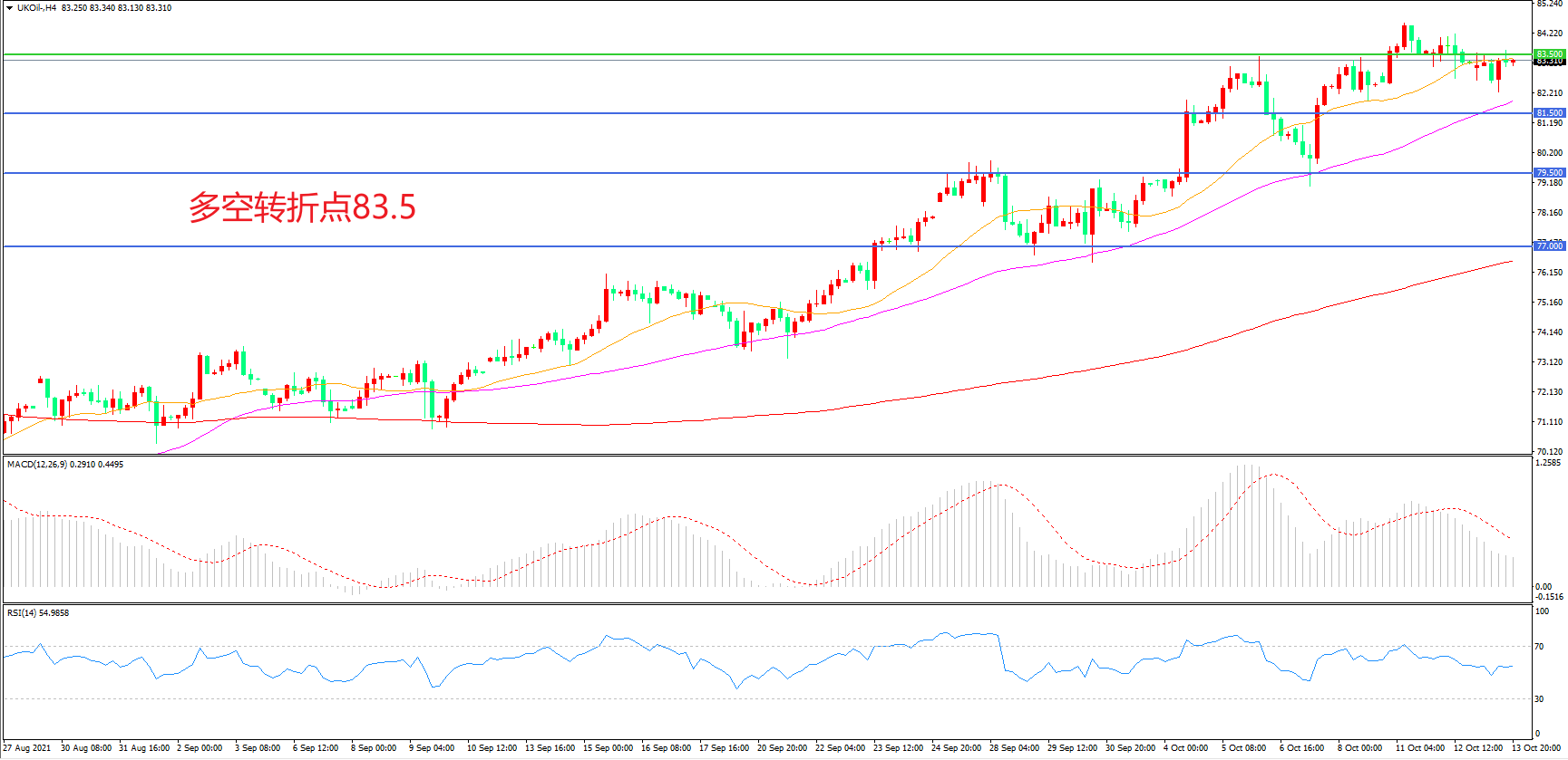 4小时图看,油价长阳拉升后延续高位震荡,多头趋势明显,均线系统呈多头排列,MACD红柱增加,RSI指标走平,日内延续上行概率较大。