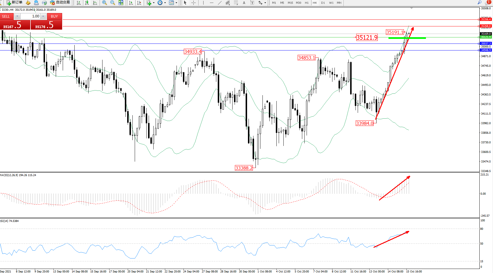 道琼斯指数DJ30——4小时K线图显示: