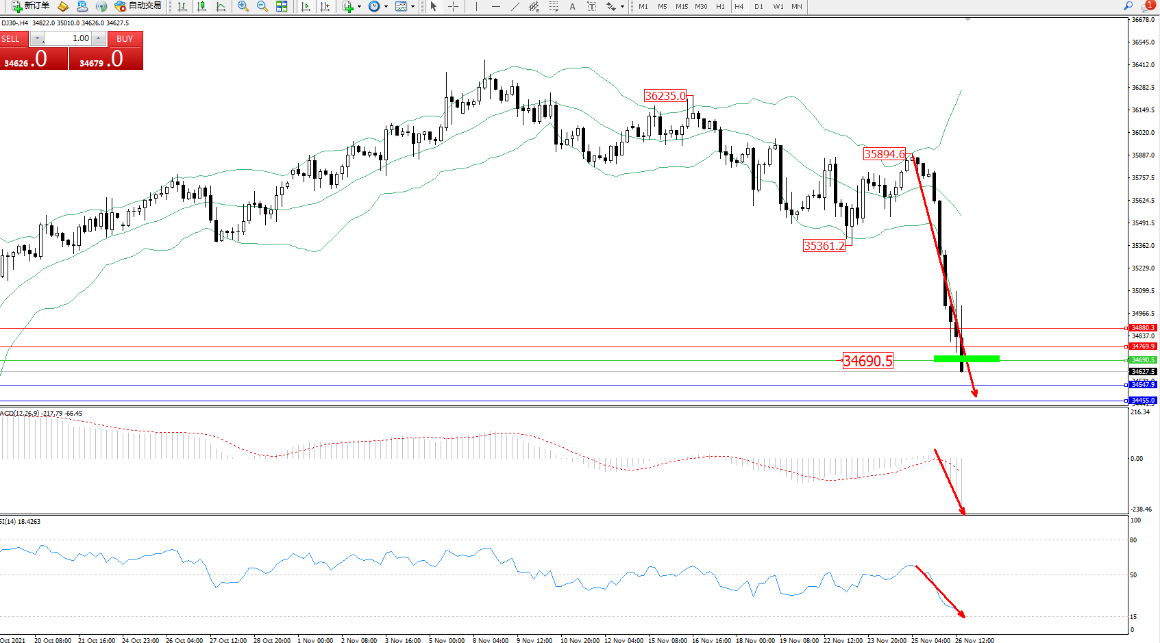 道琼斯指数DJ30——4小时K线图显示: