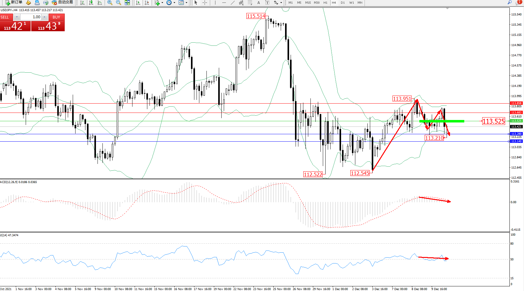 技术点评:低位多头动力延续布林带指标通道中上轨区间持续震荡上扬,高位抵达113.951位置遇阻回撤,高位呈M顶走势回撤下行,触及113.210位置后有继续下行迹象,布林带指标呈收口走势平移,MACD指标处于0轴线上侧弱势徘徊,RSI指标纠结于50均衡线附近弱势整理中;