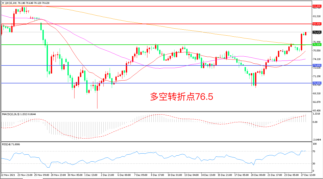 交易策略:在76.50之上看涨,目标80. 00               83.00