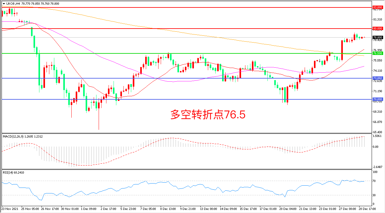 交易策略:在76.50之上看涨,目标80. 00               83.00
