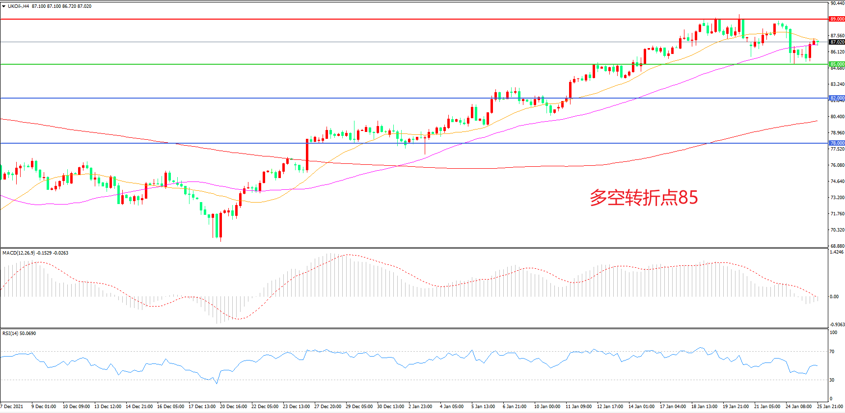 周二(1月25日),俄乌局势加剧供应中断担忧,投资者对原油的购买意愿依然强劲,布伦特原油延续强势表现,收报87.02美元/桶。今天晚上市场将迎来两大数据的冲击,首先是EIA数据的公布,其次是美联储会议的公布,这两个消息都有可能会对油价造成巨大的影响,短线操作谨慎追多。