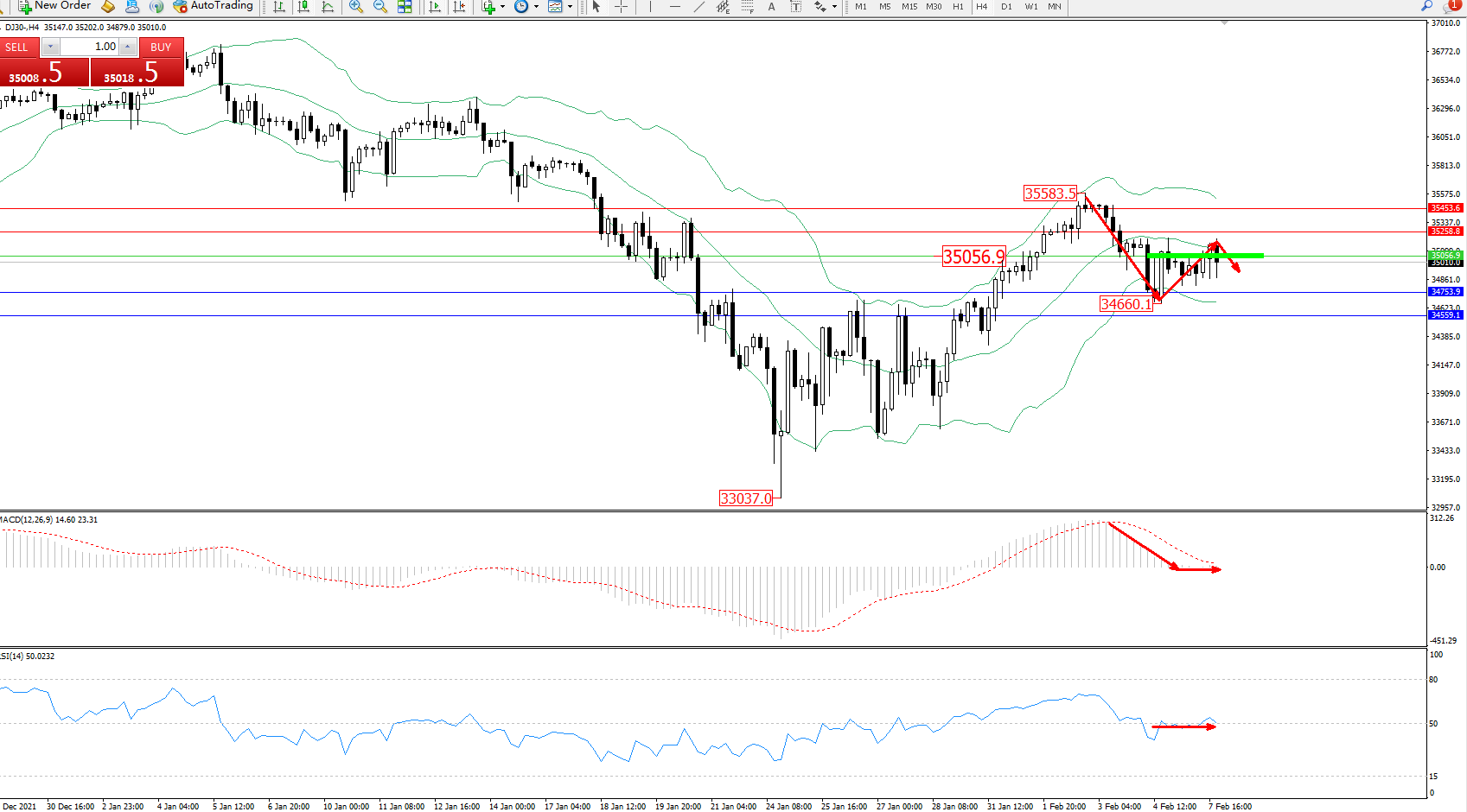 道琼斯指数DJ30——4小时K线图显示: