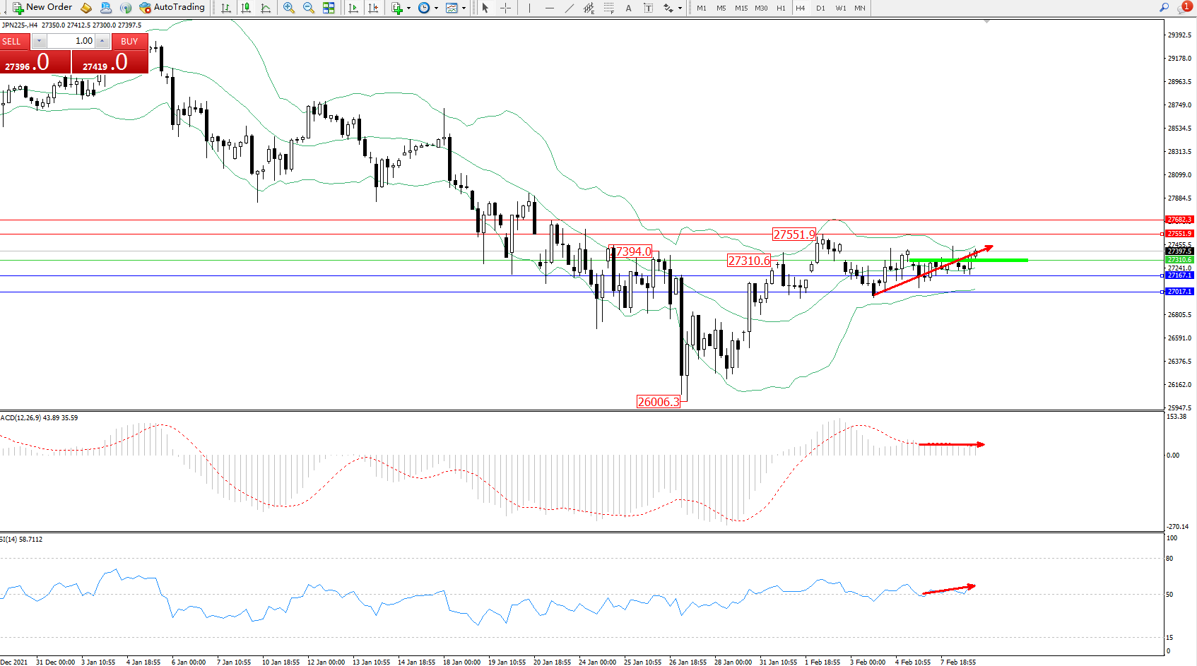 日经指数JPN225——4小时K线图显示: