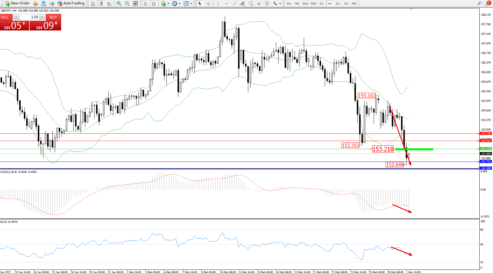 交易策略:153.218下方看跌,目标152.753、152.500