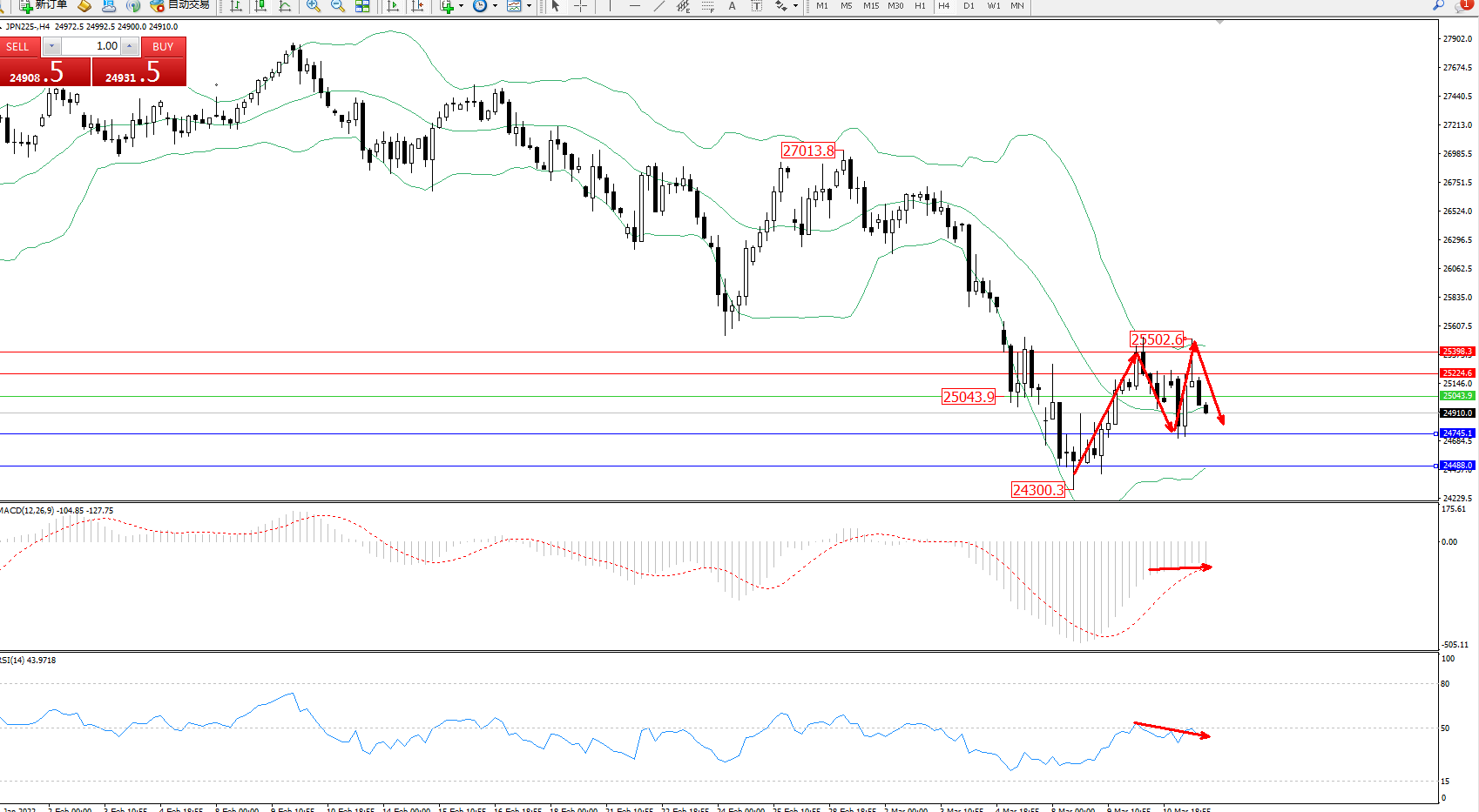 日经指数JPN225——4小时K线图显示: