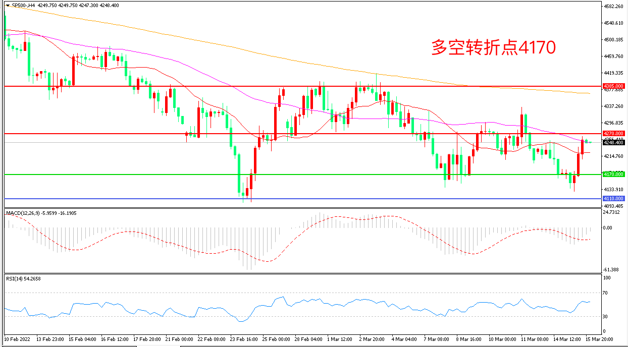 周二(3月15日),原油大跌暂时缓和了通胀担忧,投资者静候美联储公布货币政策决议,标普500自低位出现反弹,收报4249.75点。虽然以快速加息打击需求的方式来抑制通胀并非良策,但2022年的美联储别无选择,美国经济衰退的风险将显著加大,重点关注周四议息会议的结果。