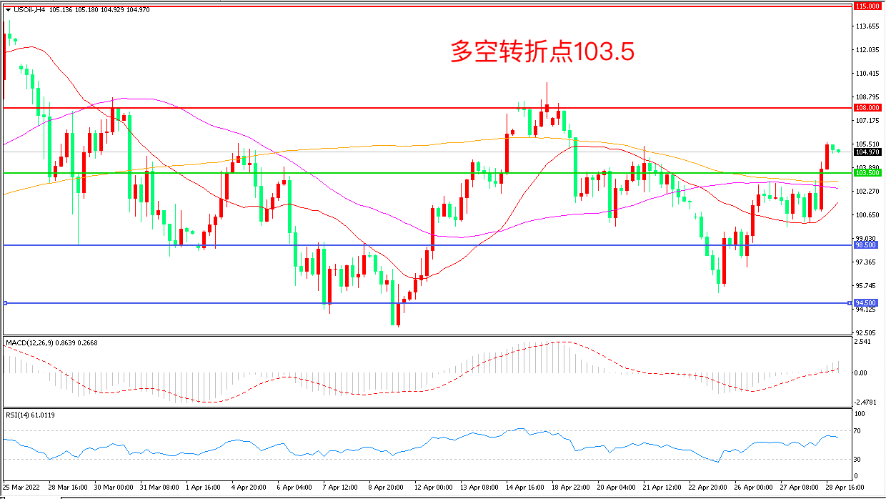 周四(4月28日),有消息称德国准备分阶段停止购买俄罗斯石油,为欧盟禁止进口俄罗斯石油扫清障碍,美国WTI原油闻讯大涨,收报104.94美元/桶。德国此前一直是禁运的主要反对者,此次180度大转变让欧盟国家更有可能一致同意对俄罗斯石油实行分阶段的禁运,在地缘风险飙升的情形下,油价上涨概率较大。