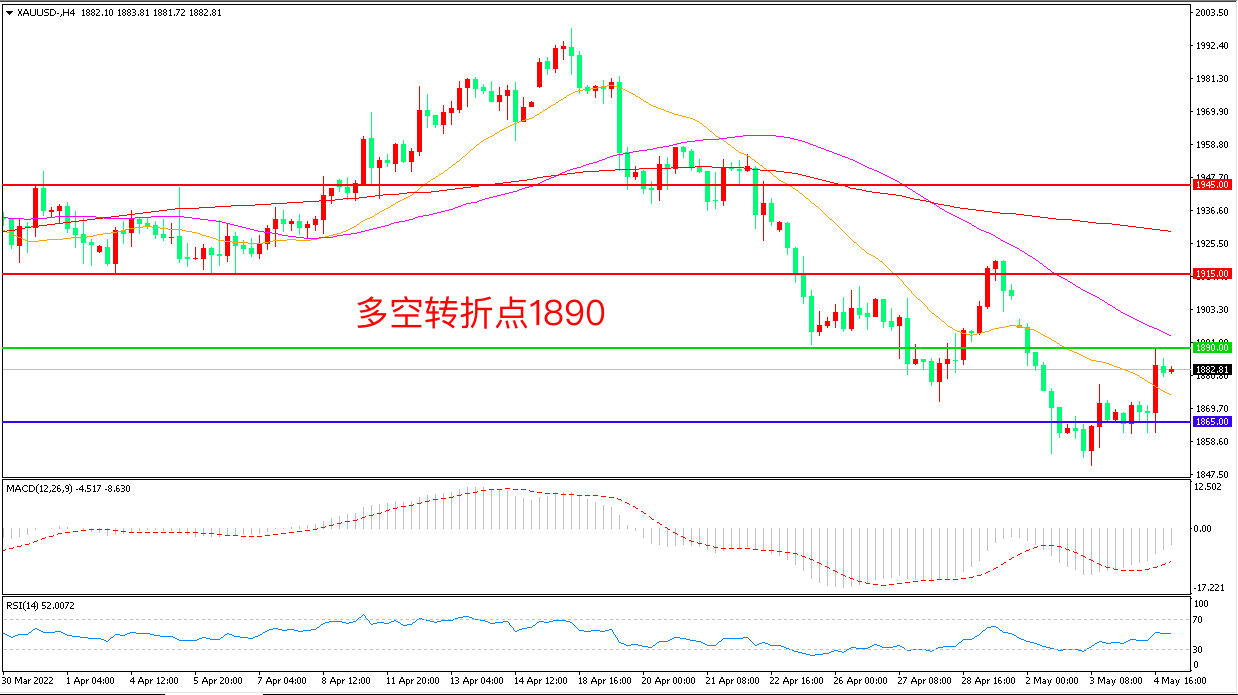 周三(5月4日),美联储宣布加息50个基点、符合市场预期,但鲍威尔会后发言排除了更大幅加息的可能性,美元指数和美国国债收益率快速跳水,现货黄金先跌后涨,收报1882.94美元/盎司。与市场的此前加息75个基点的高预期相比,这一决定有些温和,从而引发典型的买预期、卖事实行情,美元走软将为金价短线上行提供支持,重点关注本周五非农就业数据的表现。