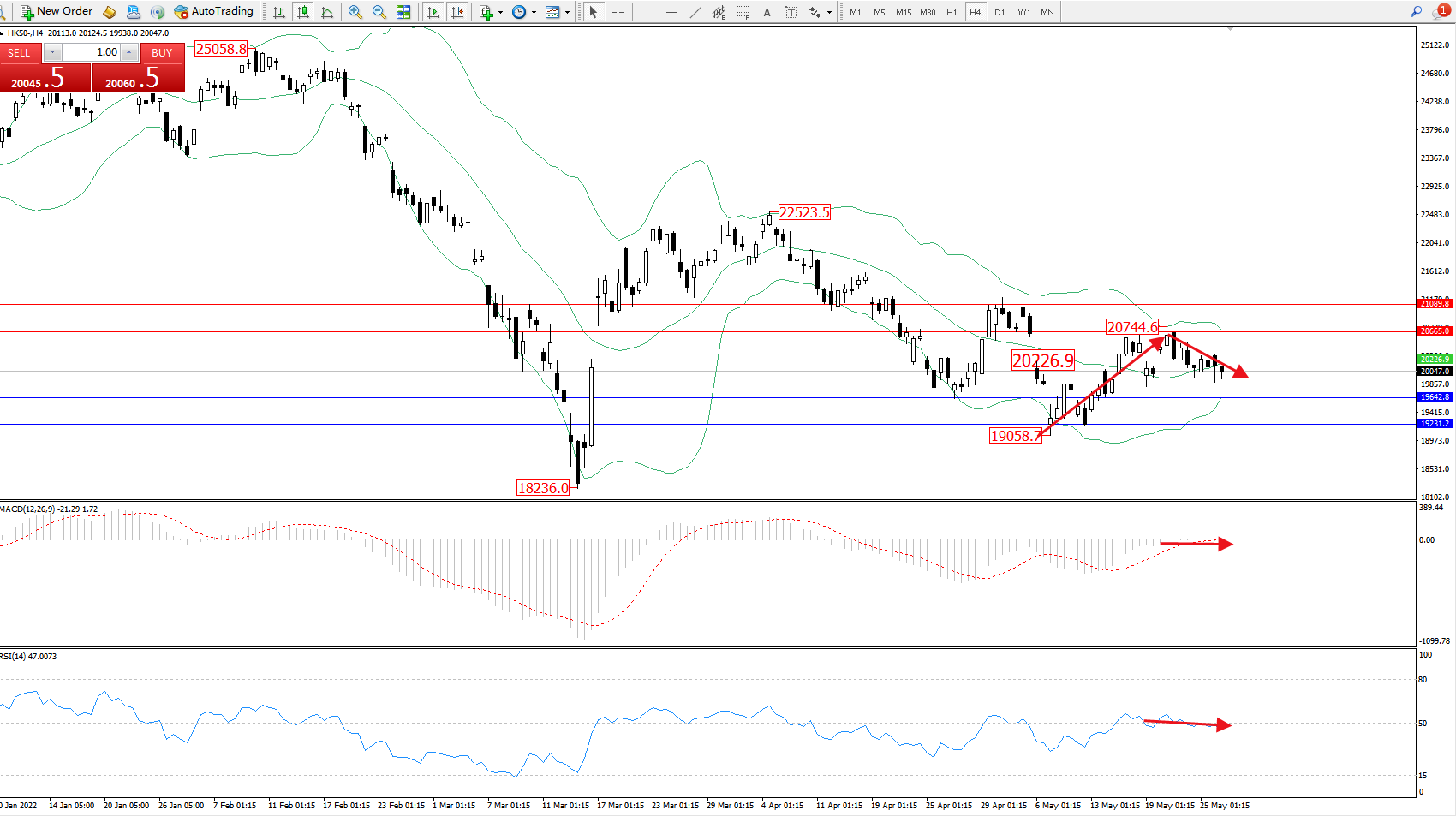 恒指HK50 ——4小时K线图显示: