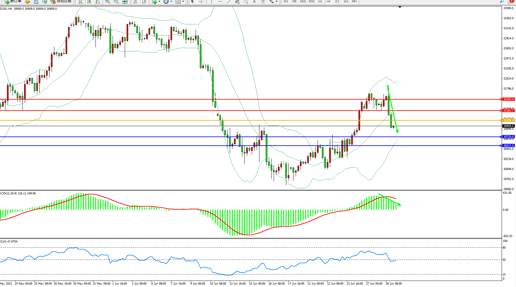道琼斯指数DJ30——4小时K线图显示: