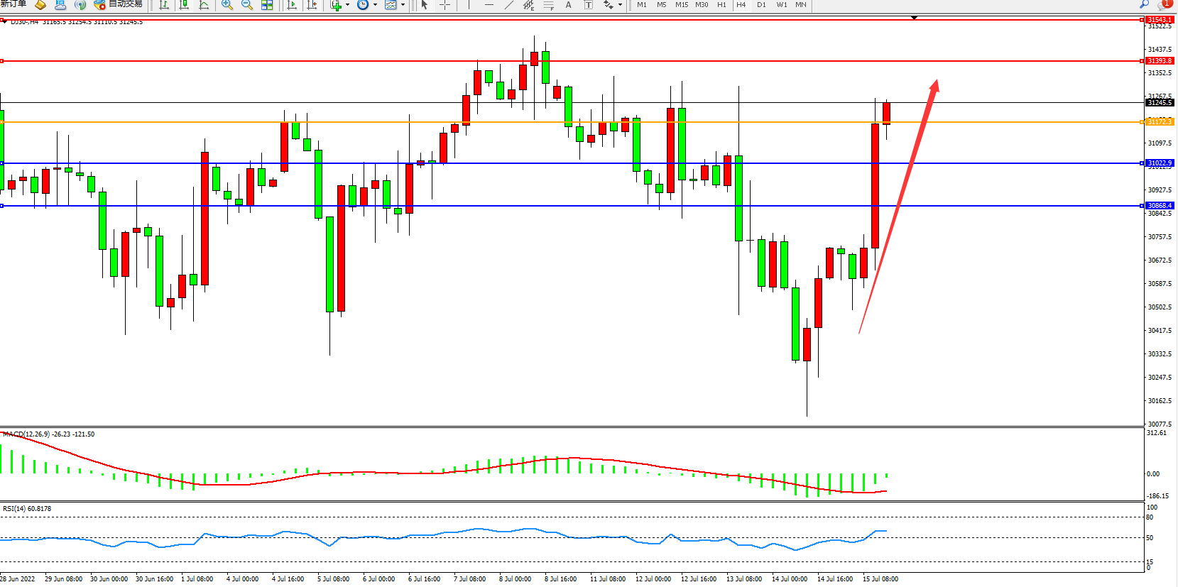 道琼斯指数DJ30——4小时K线图显示: