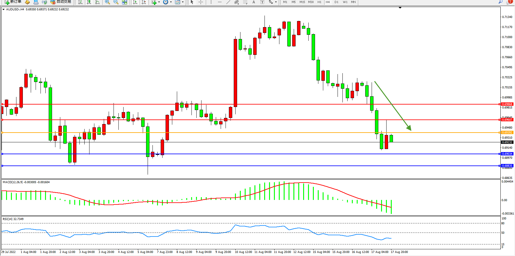 交易策略:0.69391下方看跌,目标0.69034、0.68835