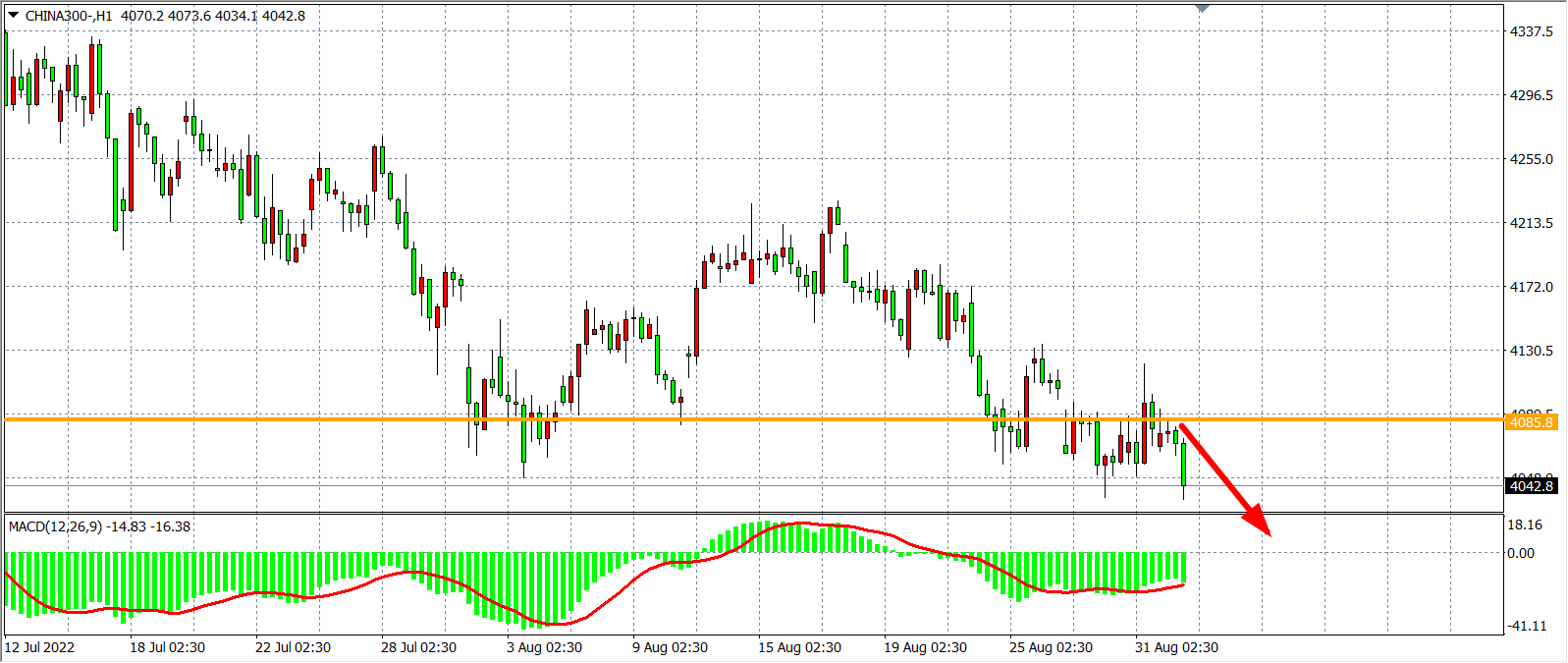 1小时图看,沪深300在4100之下持续受阻下跌,同时跌破4050支撑,趋势依旧偏空,MACD于零轴之下量能有所放大,预示行情大概延续跌势,当前阻力已下移至4085附近,日内在4085之下看继续跌,目标4000-3950